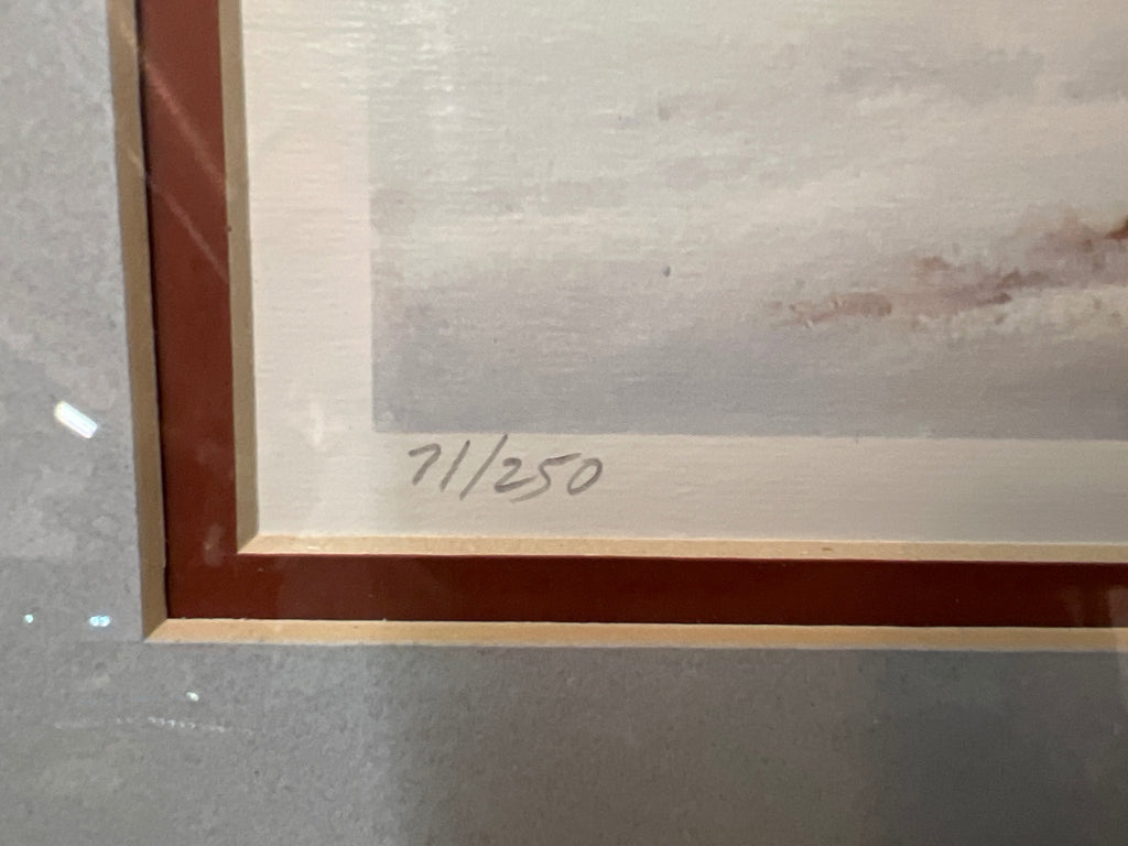 A framed art print numbered 71/250, indicating it is a limited edition. The artwork is enclosed in a wooden frame and features a landscape scene with subtle tones. The detailed numbering adds a unique touch, making it a collectible piece for art enthusiasts.